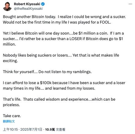 **«إذا كنت أحمق… إذا ارتفع سعر البيتكوين إلى مليون دولار، فسأفضل أن أكون أحمق على أن أكون خاسرًا. لا أحد يحب أن يكون أحمقًا أو خاسرًا… لكن هذه هي روعة الحياة. فكر جيدًا… لا تستمع إلى هرائي»، كتب.