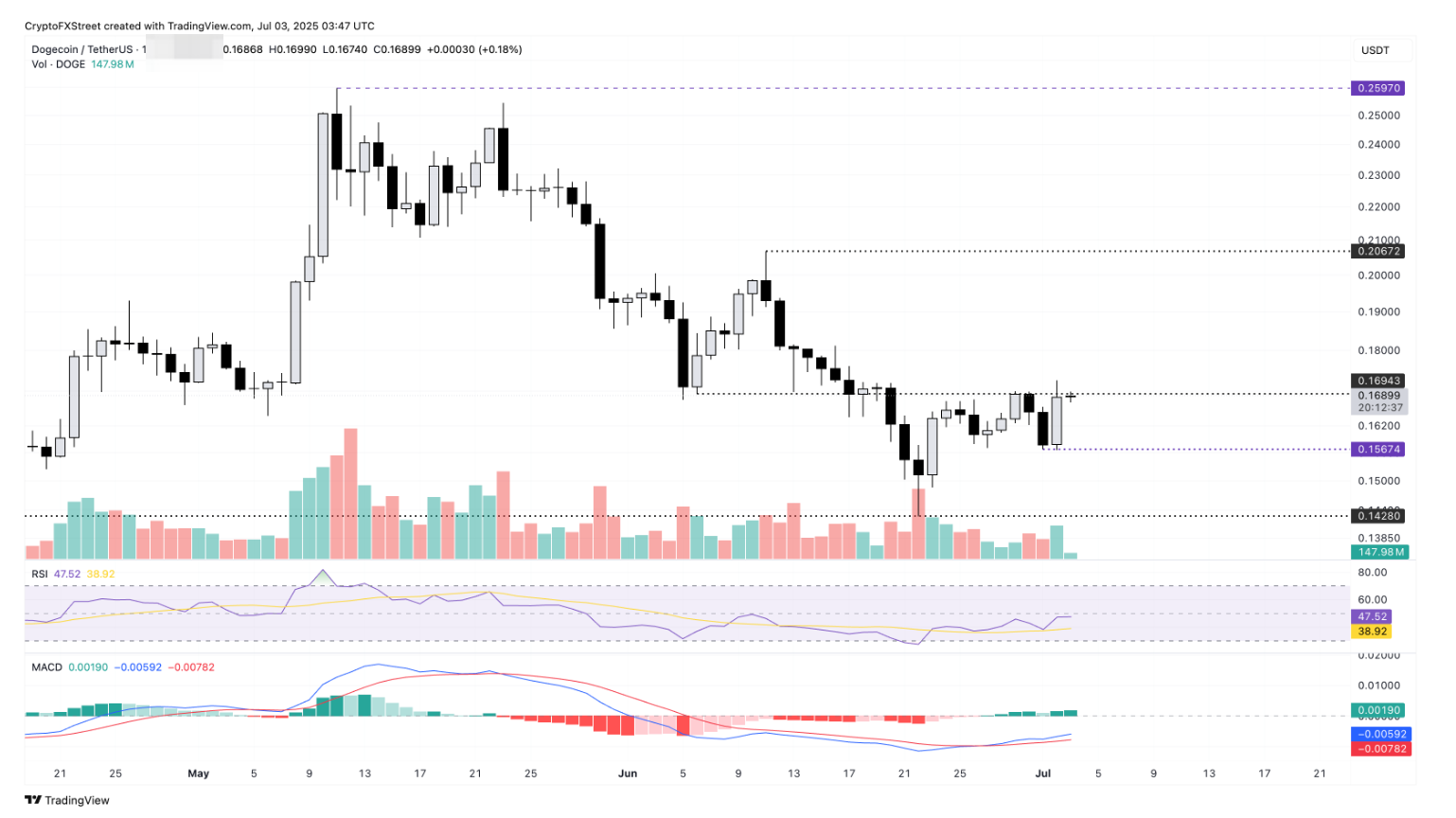 هدف الارتفاع: إذا تمكن من تجاوز مستوى المقاومة $0.1694 بنجاح، فإن توقعات سعر DOGE قد تتجه نحو أعلى مستوى في يونيو $0.2067.
