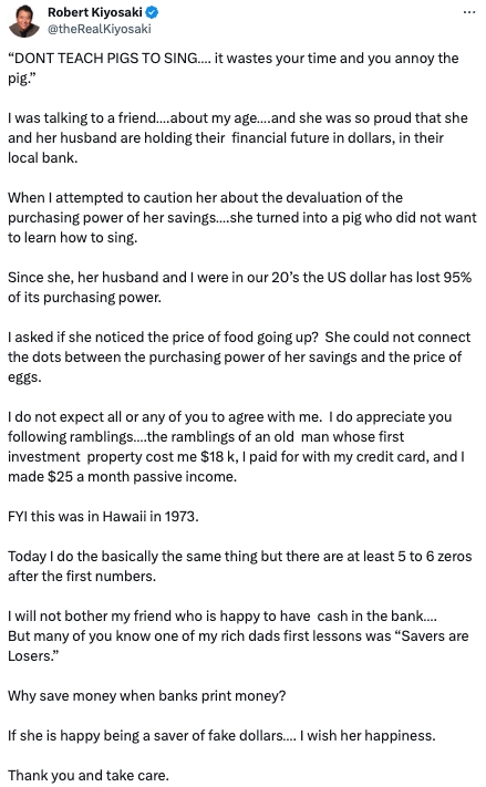 “لن أزعج صديقي الذي يحب إيداع المال في البنك… لكن الكثير منكم يعرف أن أحد الدروس الأولى التي علمها لي والدي الغني هو أن المدخرين هم الخاسرون. لماذا يجب أن نودع المال عندما تقوم البنوك بطباعة النقود؟ إذا كانت تحب إيداع هذه الأوراق النقدية المزيفة… فأنا أتمنى لها السعادة. شكراً لكم، اعتنوا بأنفسكم،” كتب في النهاية.