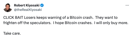كتب كيزاكي في 5 يوليو: “الفاشلون يحذرون باستمرار من انهيار بيتكوين. إنهم يريدون تخويف المضاربين. أتمنى أن ينهار بيتكوين. سأشتري المزيد فقط. اعتن بنفسك.”