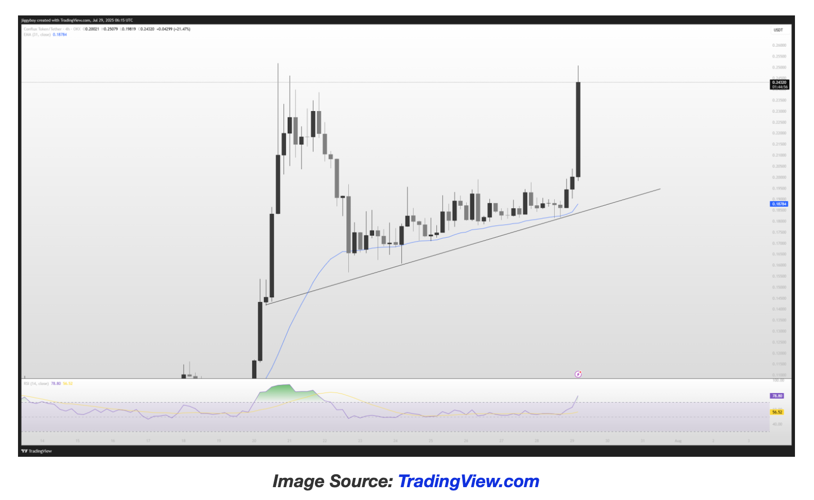 سيتم إطلاق برنامج تجريبي لـ AxCNH في سنغافورة وماليزيا في 1 أغسطس. يوفر هذا السيناريو العملي الوشيك مزيدًا من الدعم للزخم القوي المتزايد المحيط بـ CFX، مما جذب اهتمام عدد كبير من مستثمري الأصول الرقمية.