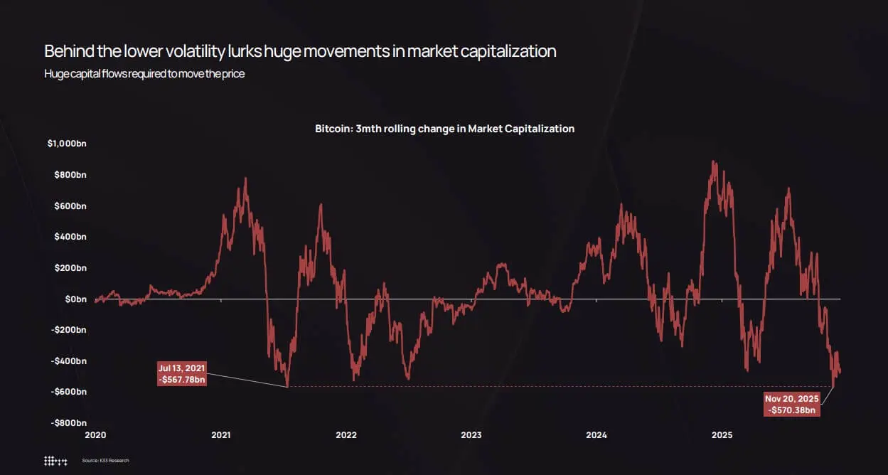 الاستنتاج الرئيسي من K33 هو: انخفاض التقلب الفعلي ليس بسبب اختفاء تدفقات رأس المال، بل لأنه الآن يتطلب تدفقات ضخمة جدًا لتحريك السعر.