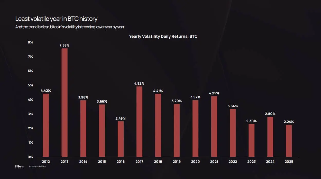 تُظهر بيانات K33 أن تقلب البيتكوين السنوي انخفض من ذروته عند 7.58% في 2013 إلى أدنى مستوى قياسي عند 2.24% في 2025.