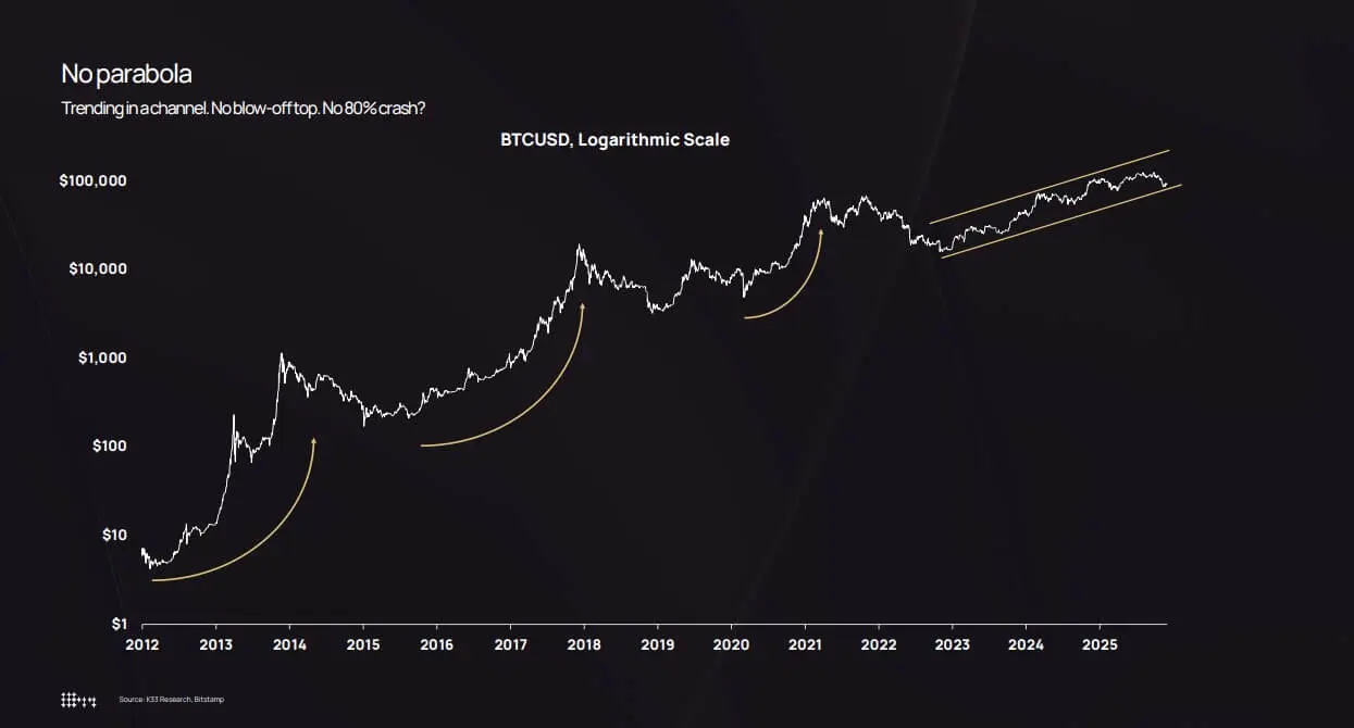 وفقًا لـ K33، فإن الانخفاض بنسبة حوالي 36% في أكتوبر لا يزال ضمن نطاق التصحيح التاريخي للبيتكوين. الاختلاف هو أن الانخفاضات السابقة بنسبة 36% كانت تحدث عادةً في بيئة تقلب حوالي 7%، وليس عندما يكون التقلب حول 2.2%.