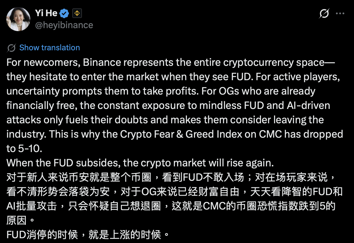 Binance-Mitbegründer He Yi äußerte sich offen über die jüngsten FUD-Turbulenzen rund um die Börse, wies auf die Reaktionen verschiedener Gruppen angesichts der Panik hin und verband den Wendepunkt der Marktstimmung mit einem Rückgang des CMC Panic and Greed Index um 5 auf 10.