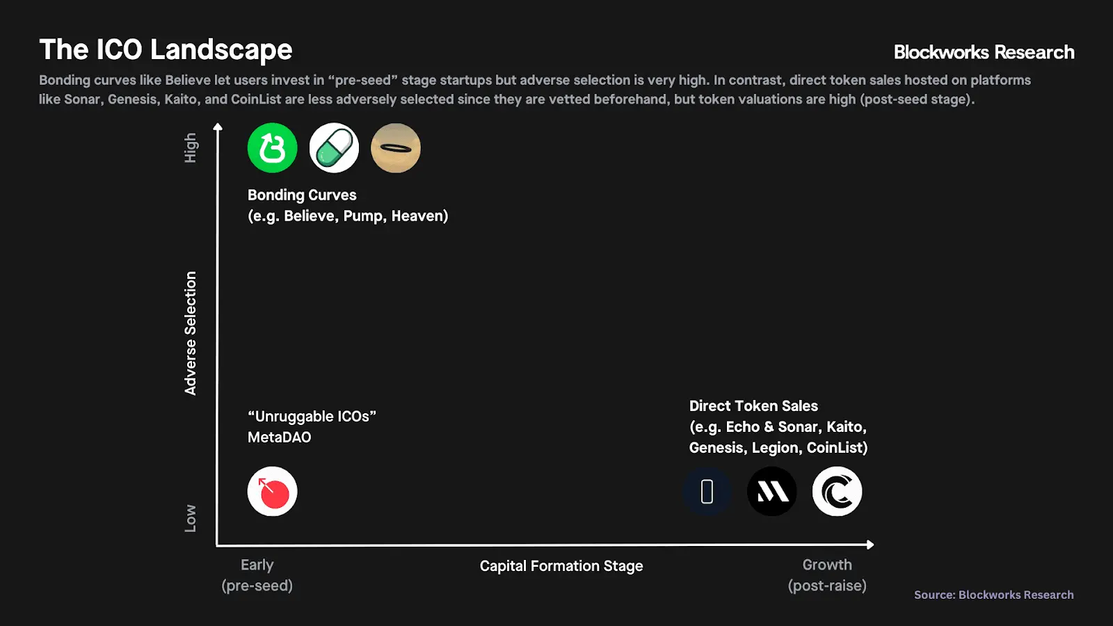 Contexto ICO | Fuente: Blockworks ResearchSin embargo, la demanda de financiamiento transparente on-chain sigue siendo muy alta. El modelo de Echo, con la filtración de participantes, el uso de contratos inteligentes verificables y la tabla de capital (cap table) pública, proporciona un marco de cumplimiento legal para los inversores minoristas.