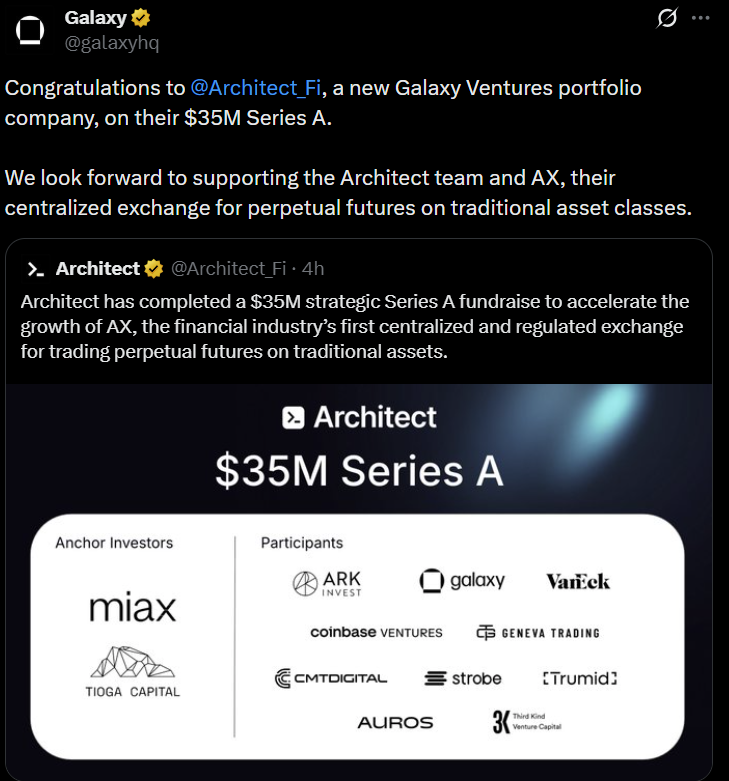 Pada hari Selasa, The Information melaporkan bahwa startup Harrison, Architect Financial Technologies, menggunakan funding untuk membangun platform perdagangan institusional yang mencakup derivatif, ekuitas, futures, dan aset digital. Peserta dalam putaran ini termasuk Miax, Tioga Capital, ARK Investment, Galaxy, dan VanEck.