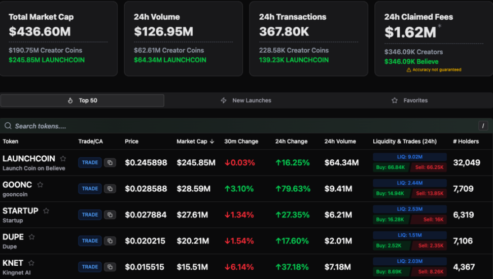 図10:Believeエコシステムの市場統計データ、時価総額ランキングのトークン、取引量、24時間の変動幅(2025年)[11]