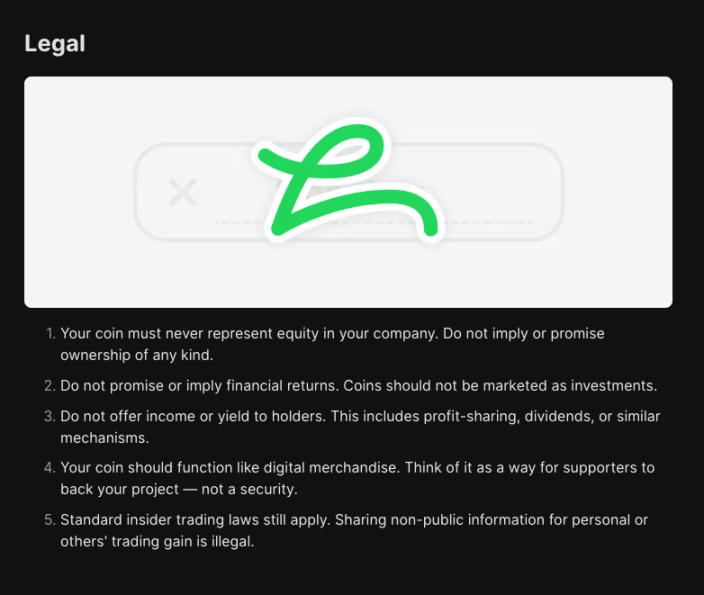 LaunchCoinの公式ガイドラインに基づき、トークン自体が証券または投資商品として分類されないように、プラットフォームは非常に厳格な法的コンプライアンス要件を設定しています。例えば、トークンは株式を代表してはならず、あらゆる形態の収益還元を暗示してはなりません。彼らの設計の目的は、プロジェクトへの支持を表明するデジタル記念品のようなものであり、収入、配当、または利益分配をもたらす証券ではないべきです。
