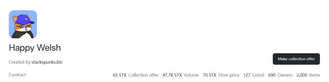 過去 1 週間で、Stacks エコシステムで最も人気のある NFT プロジェクトは Happy Welsh であり、そのプロジェクト トークンは、今年上半期のゼロからこの価格の波に至るまで数十倍に急騰しました。 Happy Welsh の総数量は 2000 で、下限価格は 70 STX です (以下を参照)。