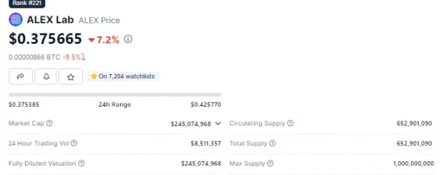 ALEX は Alex Labs のネイティブ トークンであり、流動性とステーキングを提供するプラットフォームの報酬媒体でもあり、ALEX の現在の価格は 0.375 米ドル、市場価値は約 2 億 4,500 万米ドルです。