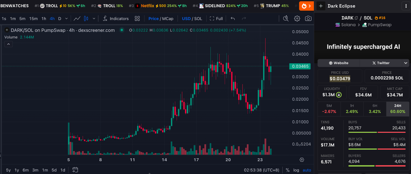 最近暗号資産市場をフォローしているなら、$DARKの驚くべきパフォーマンスに気づいているかもしれません:アメリカのSEC新任議長が暗号化に友好的な信号を発信した背景の中で、市場は全面的に回復し、ソラナエコシステムのAIミームプロジェクトである$DARKがこの上昇のリーダーとなりました。