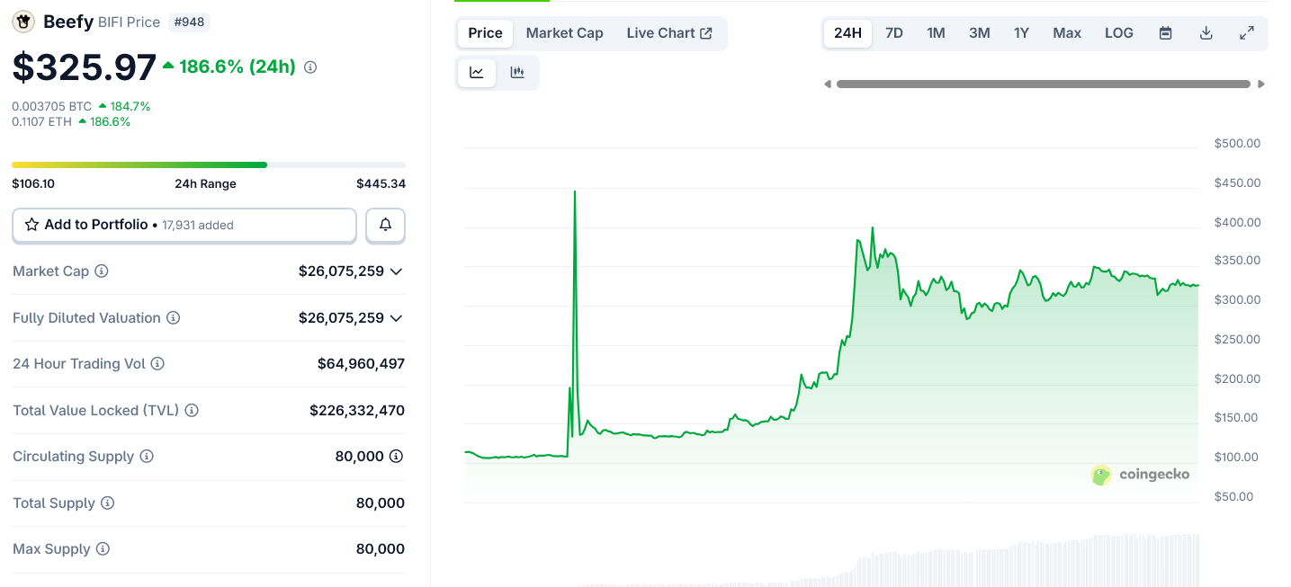 Source: CryptoNewsNet Original Title: このDeFi利回りトークンはクリスマスに200%上昇、その理由は Original Link: あまり知られていないDeFi利回りトークンが、ほとんどの暗号資産が静かに取引される中、三桁の上昇を記録し、市場を驚かせました。Beefy FinanceのBIFIトークンは、24時間で200%以上急騰し、一時的に$400 レベルに達した後、冷却しました。これは市場データによるものです。