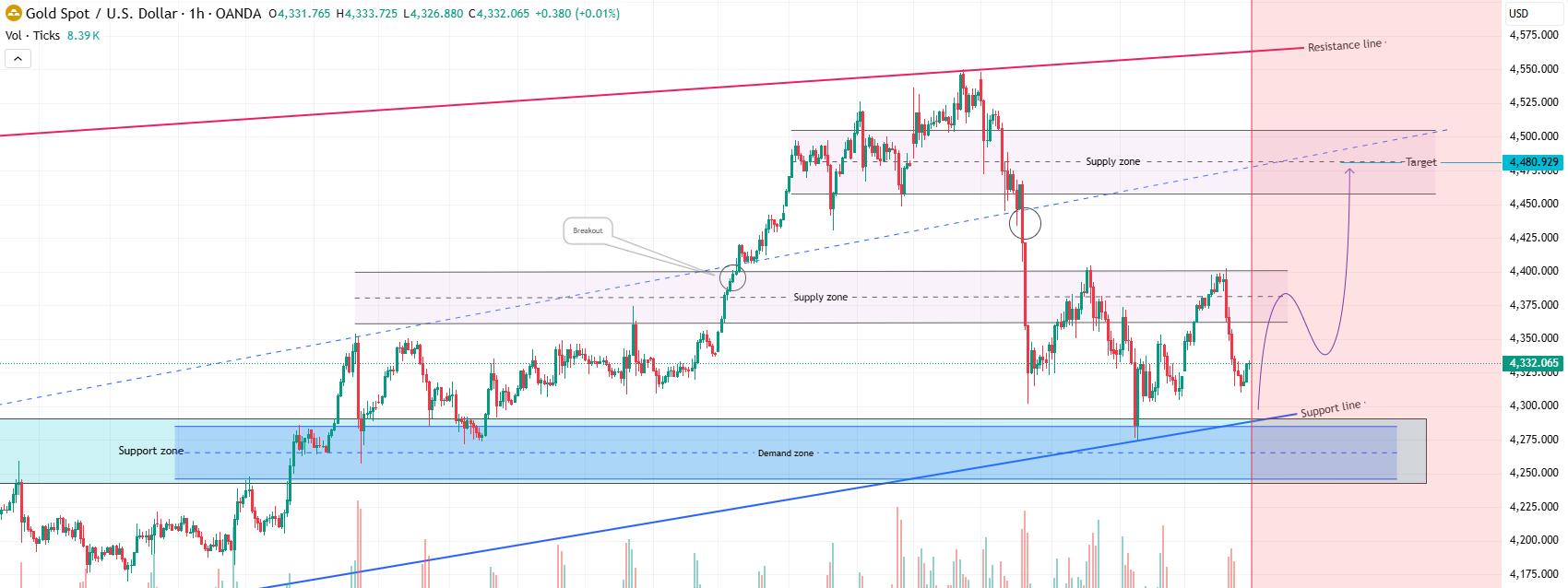 下値では、$4,300-$4,280エリアが重要な短期サポートゾーンとして浮上しています。この範囲を明確に割ると、金はより深い調整に入り、$4,100台後半まで下落する可能性があります。上値では、$4,370-$4,400エリアが重要な供給ゾーンです。このエリアを明確に取り戻すことができれば、構造は再び強気に転じ、$4,450-$4,500の高値を再挑戦する展望が開けます。