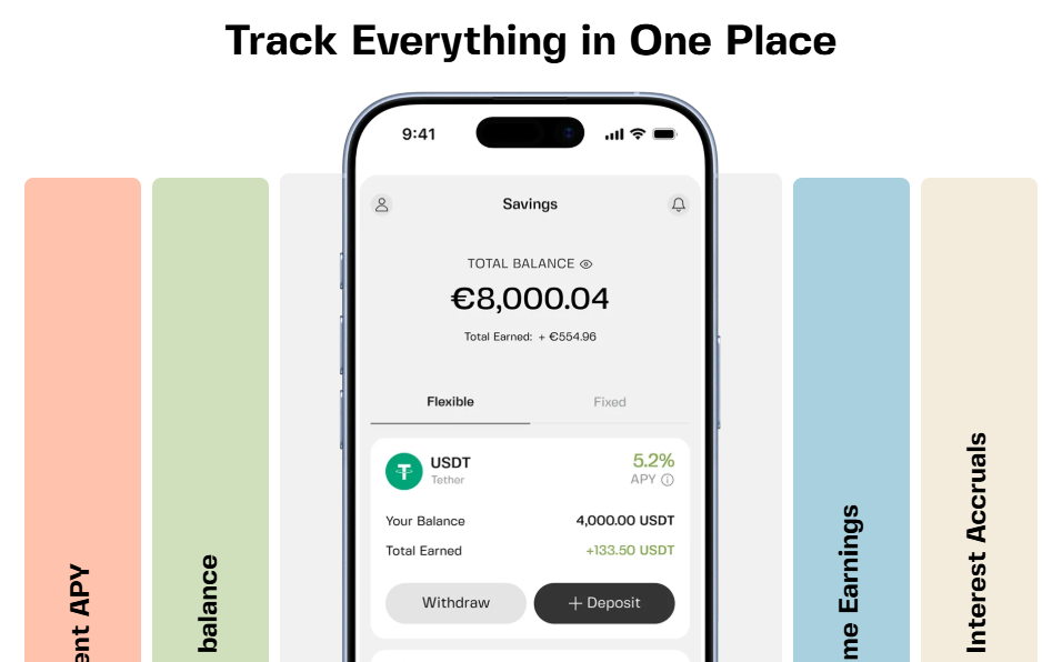 この製品は、EUR、USDT、USDCに対して固定の5.2% APYを提供し、アプリ内に明確に表示され、隠れた階層はありません。ユーザーは10 EURまたはステーブルコインから始めることができ、預け入れ金額に関係なく、毎日の暗号資産利息収益の恩恵を簡単に受けることができます。