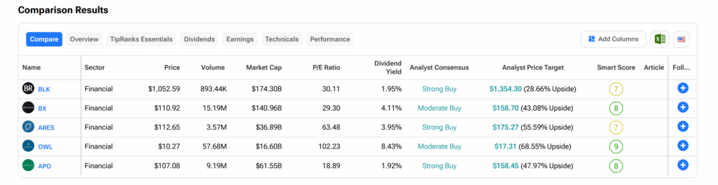 Of all the investment firms featured in this article, Blue Owl currently boasts the biggest upside of about 69% at an average price target of $17.31, the TipRanks Stock Comparison tool shows. This is despite OWL holding a Moderate Buy consensus rating from analysts.