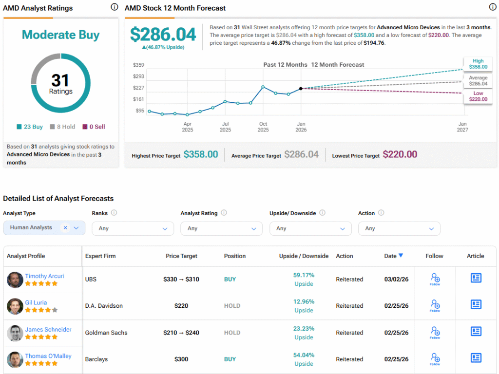 Turning to Wall Street, the analysts’ consensus rating for AMD is Moderate Buy, based on 23 Buy and eight Hold ratings over the past three months. With that comes an average AMD stock price target of $286.04, representing a potential 46.87% upside for the shares.