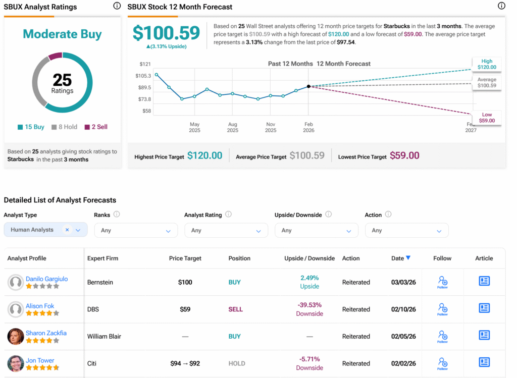 Turning to Wall Street, analysts have a Moderate Buy consensus rating on SBUX stock based on 15 Buys, eight Holds, and two Sells assigned in the past three months, as indicated by the graphic below. After a 13.44% loss in its share price over the past year, the average SBUX price target of $100.59 per share implies 3.13% upside potential.
