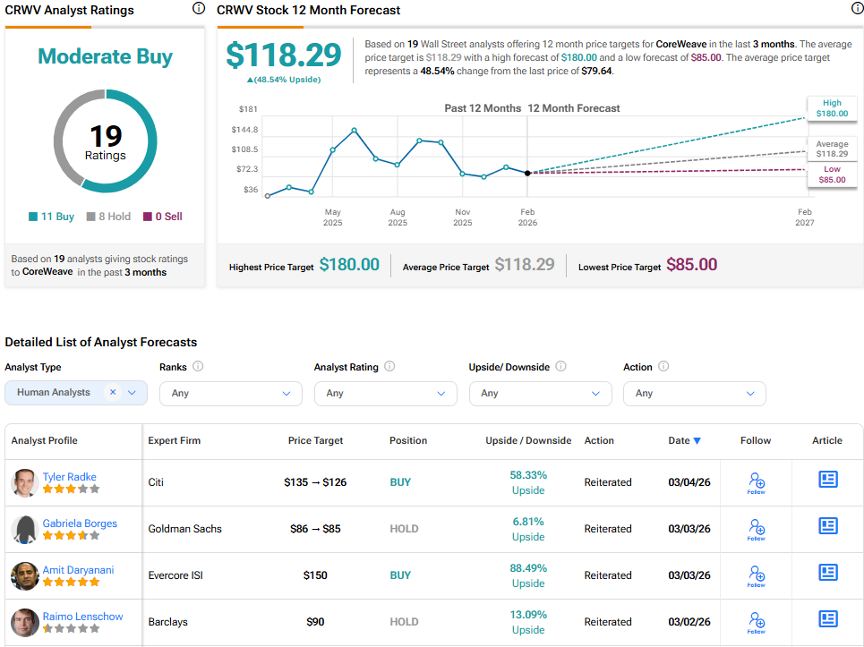 Turning to Wall Street, analysts have a Moderate Buy consensus rating on CRWV stock based on 11 Buys, eight Holds, and zero Sells assigned in the past three months, as indicated by the graphic below. Furthermore, the average CRWV price target of $118.29 per share implies 48.5% upside potential.