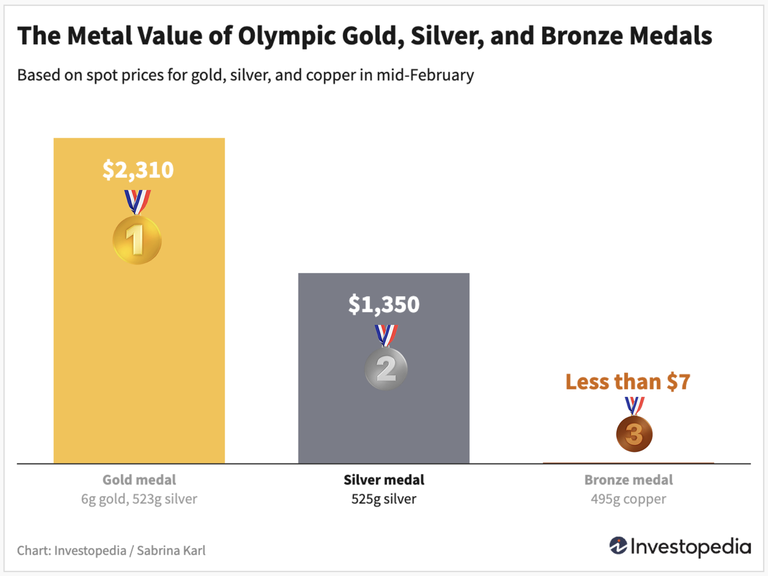 Silver medals, made of 525 grams of sterling silver, would be worth around $1,350, while bronze medals are worth far less from a materials standpoint. With copper currently priced at about $0.37 per ounce and a bronze medal comprising 495 grams of copper, the third-place medal would be worth less than $7 at today’s prices.