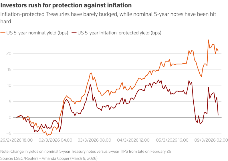 Driven by this, since the end of February, the UK’s five-year breakeven inflation rate (the difference between inflation-linked and nominal bond yields) has risen 28 basis points. On Monday, it reached nearly 3.5%, a new high since April last year.