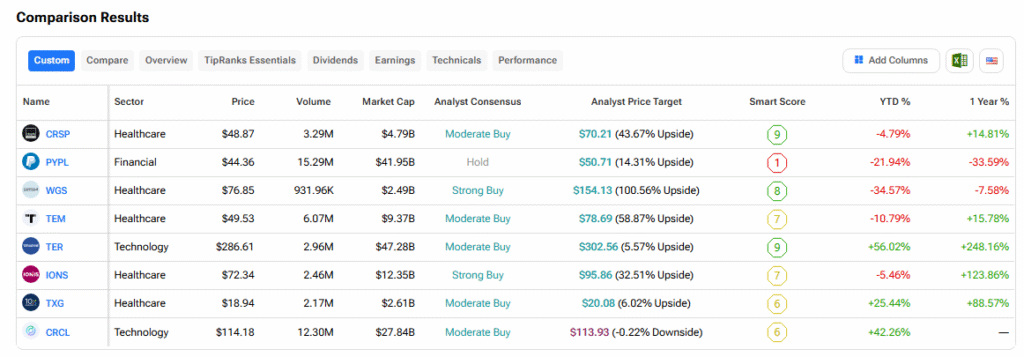 Currently, analysts rate GeneDx and Ionis Pharmaceuticals as “Strong Buy.” Among the names listed, GeneDx offers the highest upside potential of about 100%. Meanwhile, CRISPR Therapeutics, Tempus AI, Teradyne, and 10x Genomics carry Moderate Buy ratings, while PayPal is rated Hold by analysts.