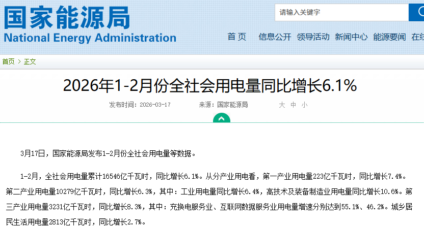 【Global Network Finance Comprehensive Report】According to the latest data released by the National Energy Administration on March 17, electricity consumption in China showed a strong recovery in the first two months of this year. The total electricity consumption across society reached 1.65 trillion kWh, an increase of 6.1% year-on-year, significantly up by 4.7 percentage points compared to the same period last year. This data indicates a steady start to the national economy this year and reveals new momentum for economic transformation and upgrading.