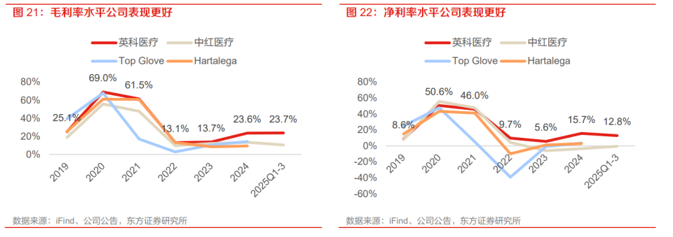 Once supply-demand balance is restored, the industry will return to stability. The segment with increasing demand—nitrile gloves—will enter a price rise phase, boosting profitability. The main competition is between domestic manufacturers and Southeast Asian producers. Before the pandemic, domestic companies held less than 30% of the global market share but have rapidly expanded, reaching over 40% in 2025, while Southeast Asian capacity growth has been limited.