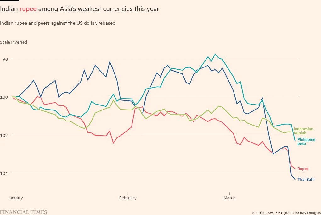The rupee “is among the more exposed EM [emerging market] currencies to the Iran war, not least because about half of India’s energy imports come from the Gulf states”, said Priyanka Kishore, founder of research consultancy Asia Decoded.