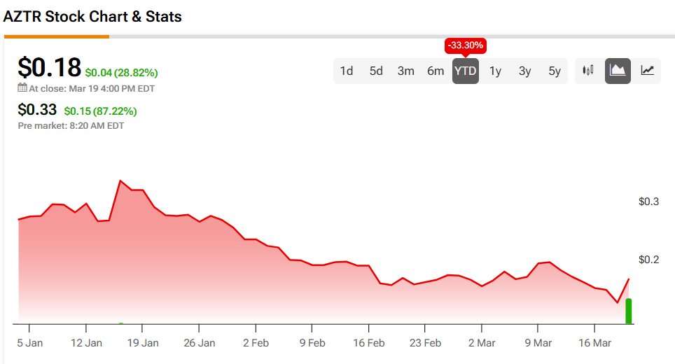 With today’s news came heavy trading of AZTR stock, as more than 166 million shares changed hands, compared to a three-month average daily trading volume of about 170,000 shares.