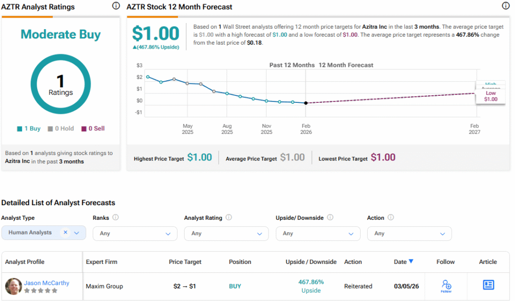 Turning to Wall Street, the analysts’ consensus rating for Azitra Inc is Moderate Buy, based on a single Buy rating over the past three months. Maxim Group analyst Jason McCarthy offers the sole coverage of AZTR stock, with a Buy rating and $1 price target, representing a potential 467.86% upside for the shares.