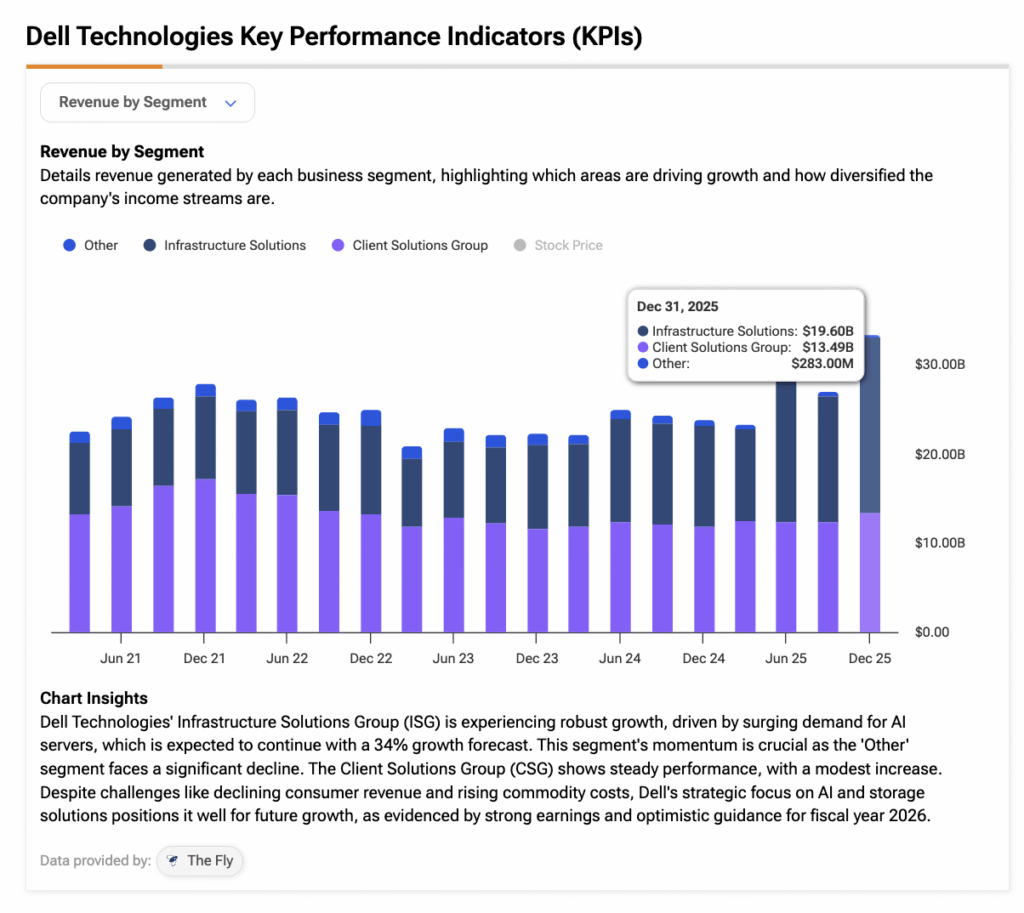 For FY26, Dell’s revenue grew 19% year-over-year to $113.5 billion. Its Infrastructure Solutions Group (ISG), which oversees Dell’s AI server business, contributed the largest portion of earnings with a record $19.6 billion in revenue, up 73% YoY. Below is a screenshot for reference.