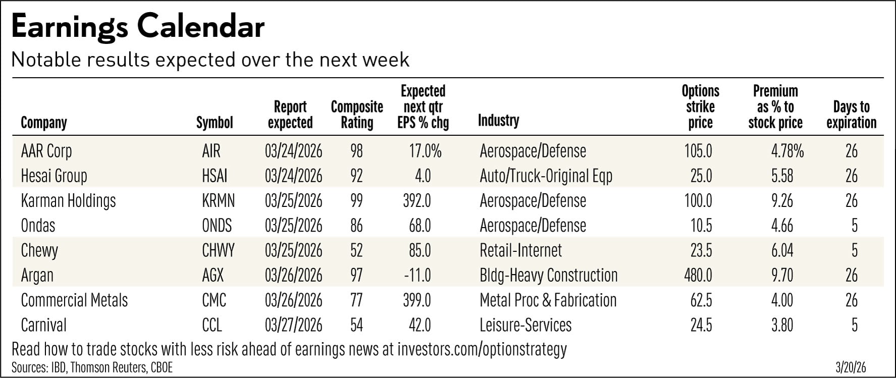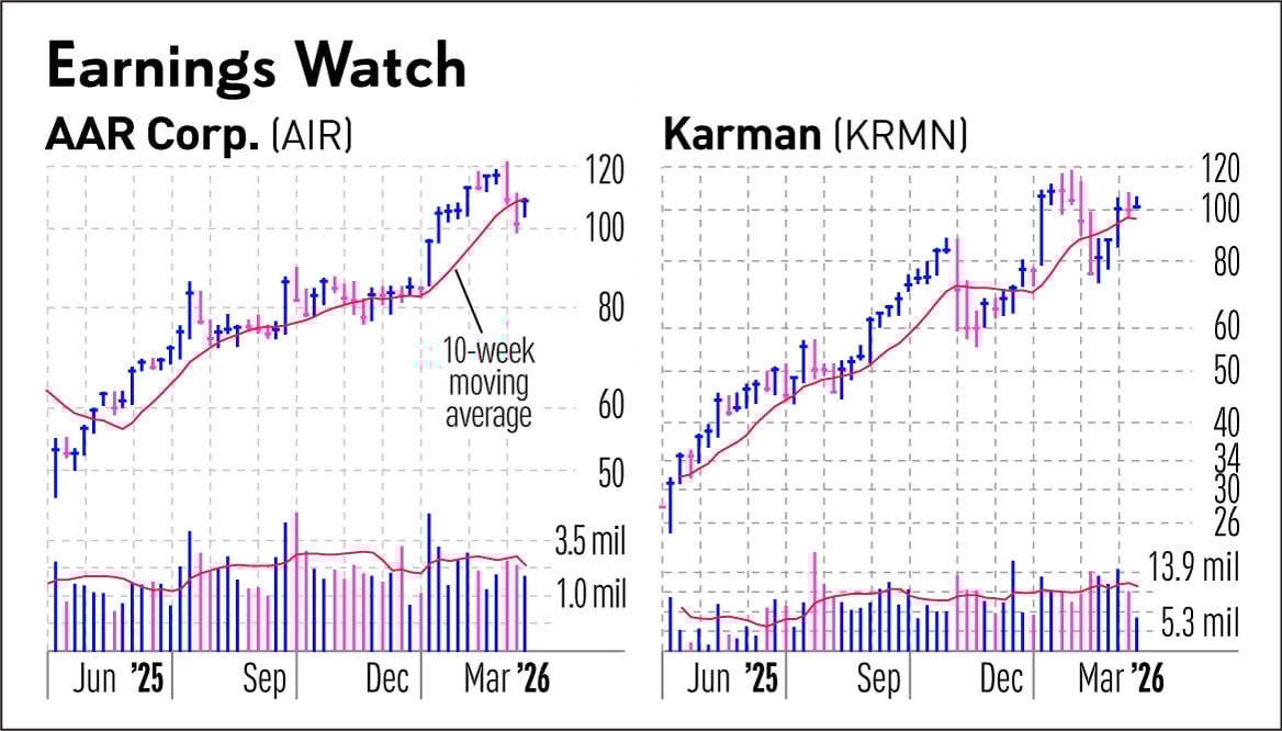 Two stocks in IBD’s aerospace and defense group — Karman Space & Defense (KRMN) and AAR Corp. (AIR) — are on the latest earnings calendar, along with recent IPO Public Policy Holding (PPHC). Karman stock gapped down to its 50-day moving average during Thursday’s market sell-off, but reversed impressively higher by the close.