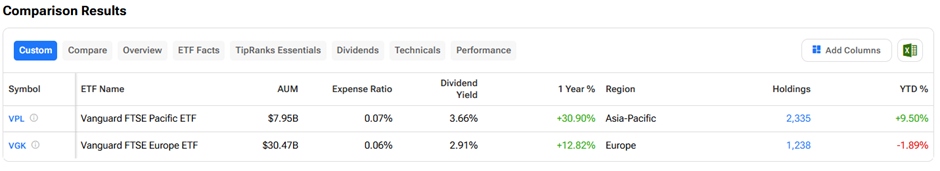 To conclude, VPL edges out VGK with superior one-year returns (32% vs. 13%), a higher dividend yield (3.65% vs. 2.91%), and exposure to Asia’s dynamic tech and commodity growth, despite VGK’s larger scale and Europe’s defensive stability.