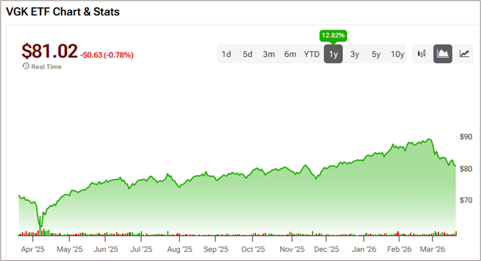 VGK’s top five holdings include ASML Holding ASML -3.60% ▼ , Roche Holding ROG +0.50% ▲ , Novartis NOVN -1.10% ▼ , HSBC Holdings HSBA -2.34% ▼ , and AstraZeneca AZN -2.82% ▼ .