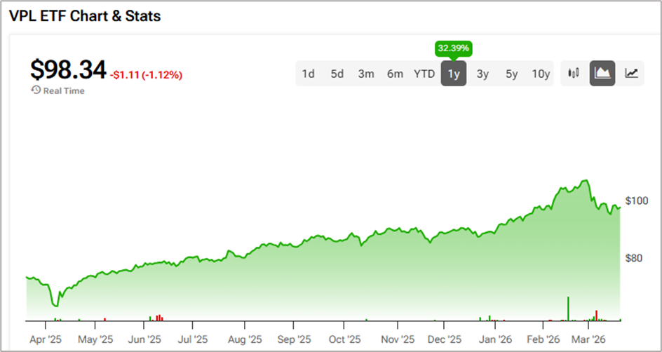 VPL has generated more than 32% for investors over the past year. The fund carries a much higher and lucrative dividend yield of 3.65%. VPL has a relatively smaller AUM of $7.95 billion but has 2,335 holdings in its portfolio.