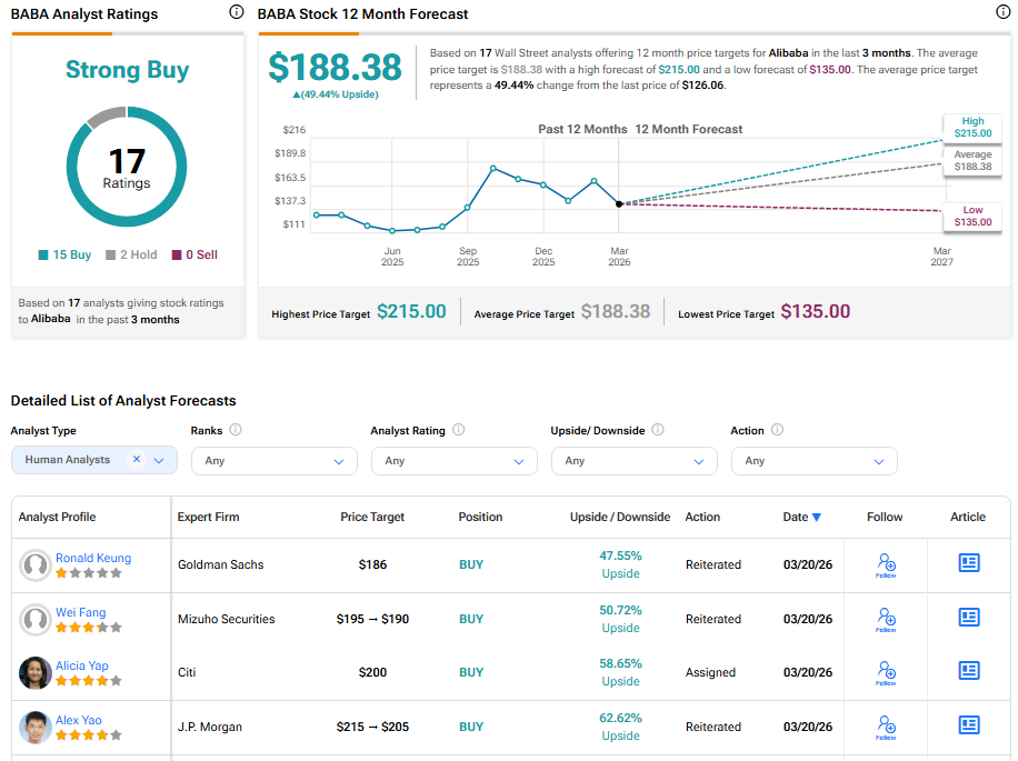 Wall Street remains constructive on the stock. Alibaba carries a Strong Buy consensus rating based on eight Buy ratings and one Hold over the past three months. The average BABA price target stands at $188.38, suggesting roughly 49.44% upside from current levels.