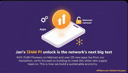 A Pi Network agendou um desbloqueio de 134 milhões de tokens PI para janeiro, após um desbloqueio de 8,7 milhões em dezembro. O desbloqueio maior coloca o foco no uso real dentro do ecossistema Pi. Desenvolvedores e colaboradores da comunidade apontaram pagamentos, serviços e procura baseada em aplicações como áreas-chave para absorver a oferta adicional.