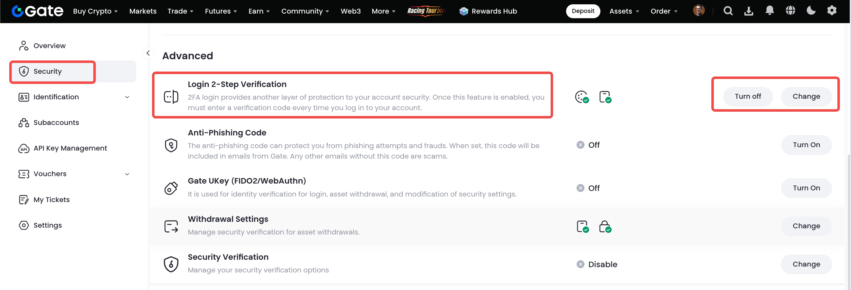 Abra a app da Gate e inicie sessão na sua conta. Clique no ícone do perfil no canto superior esquerdo e depois em "Central de segurança" > "Verificação em Duas Etapas (2FA)" para ativar a 2FA.