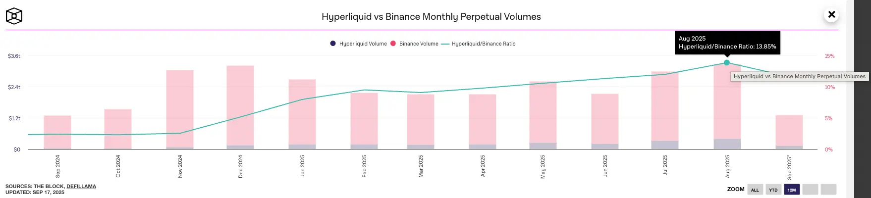 Como líder de mercado, a Hyperliquid possui uma liquidez e volume de negociação extremamente profundos. Seu volume diário de transações frequentemente atinge dezenas de bilhões de dólares, com um volume de negociação perpétua de cerca de 319 bilhões de dólares em julho de 2025, o que impulsionou o volume total de negociação perpétua em toda a cadeia a um recorde histórico (487 bilhões), com a Hyperliquid respondendo por cerca de 65%. Durante o ano de 2025, a participação de mercado da Hyperliquid estabilizou-se entre 75% e 80%, superando de longe seus concorrentes. Em agosto de 2025, o volume de negociação perpétua mensal representou 13,85% dos contratos da Binance, a maior proporção histórica. (Dados do The Block)
