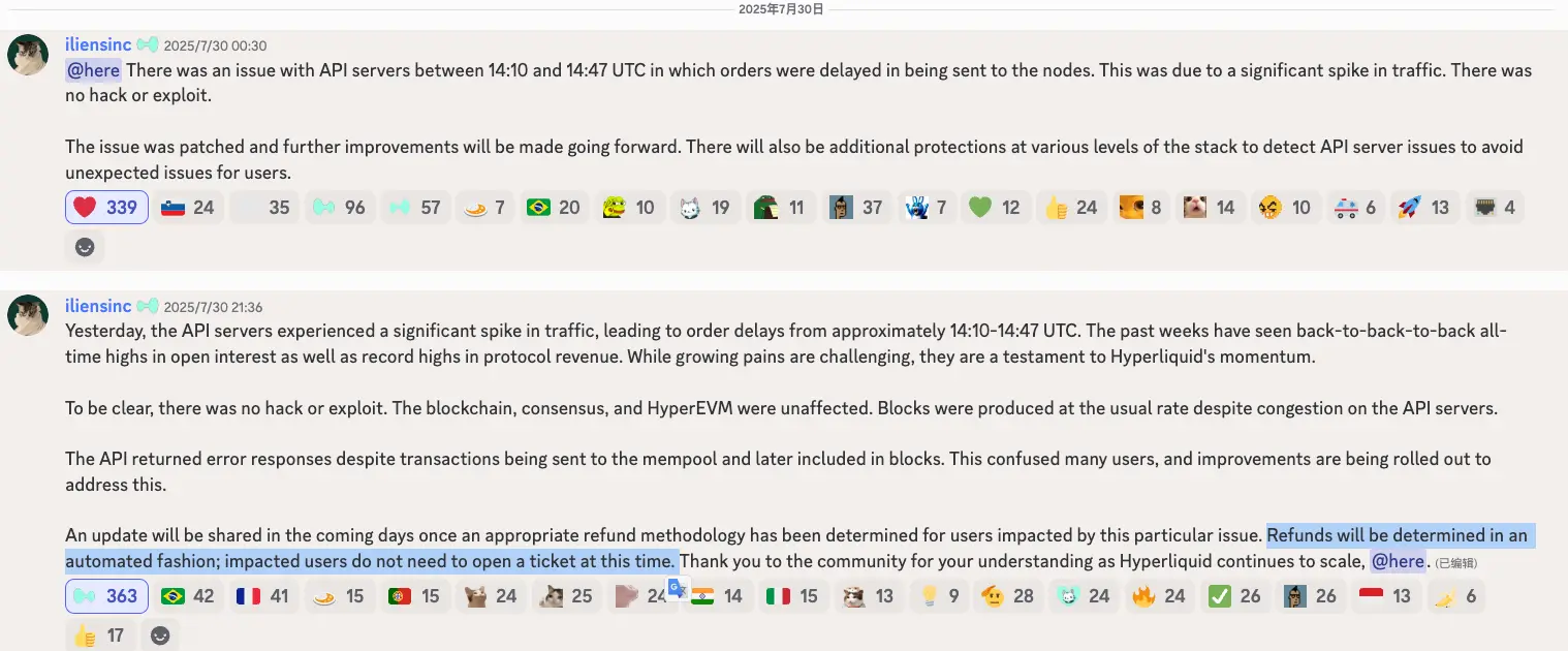 A Hyperliquid está fortemente conectada à comunidade e responde rapidamente. Por exemplo, após uma falha na API em julho de 2025 que causou uma breve interrupção, a equipe rapidamente compensou os usuários com cerca de 2 milhões de dólares em perdas, demonstrando um estilo de “resposta rápida e responsabilidade”. Os usuários tiveram uma boa experiência e a comunidade elogiou bastante.