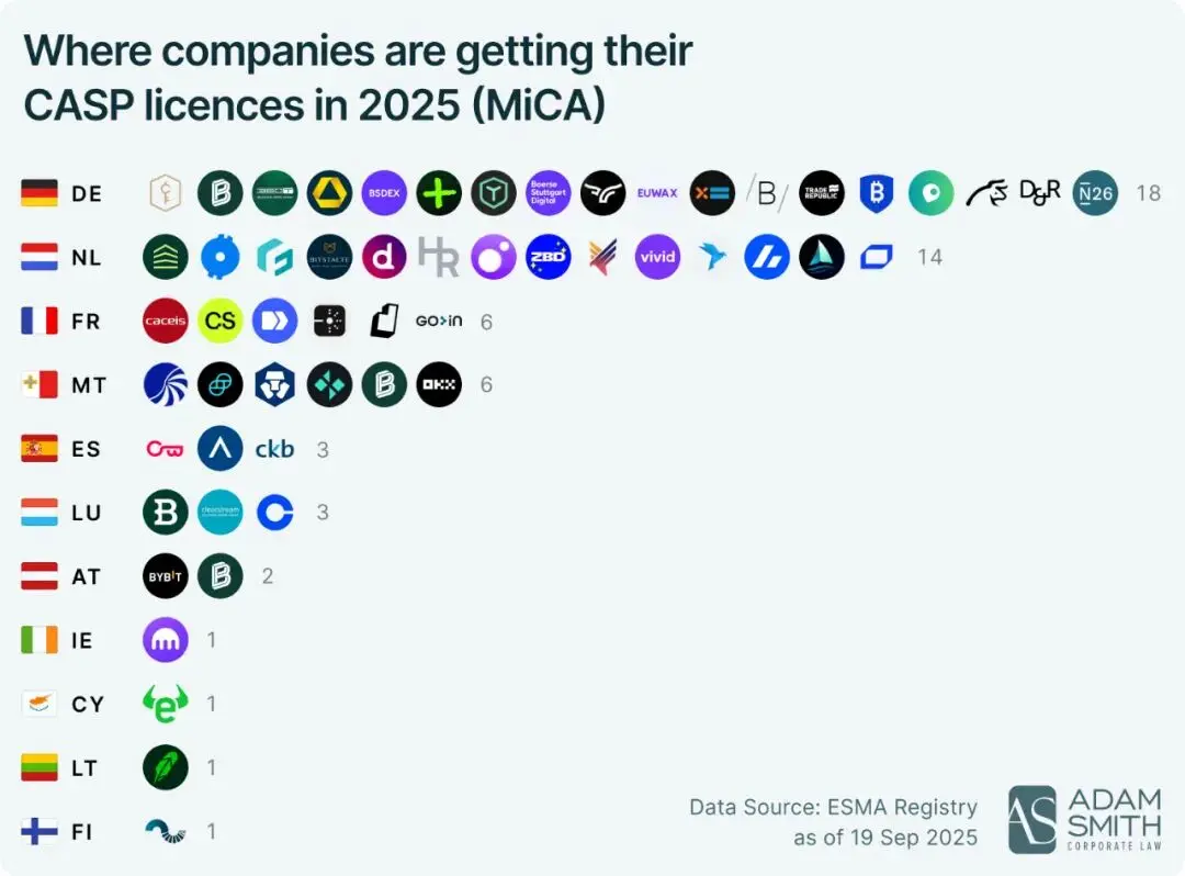 A União Europeia, através da implementação aprofundada da legislação MiCA, construiu o sistema de conformidade mais rigoroso do mundo. Até novembro de 2025, 57 instituições já obtiveram a licença MiCA, concretizando uma supervisão completa desde a emissão até a custódia.