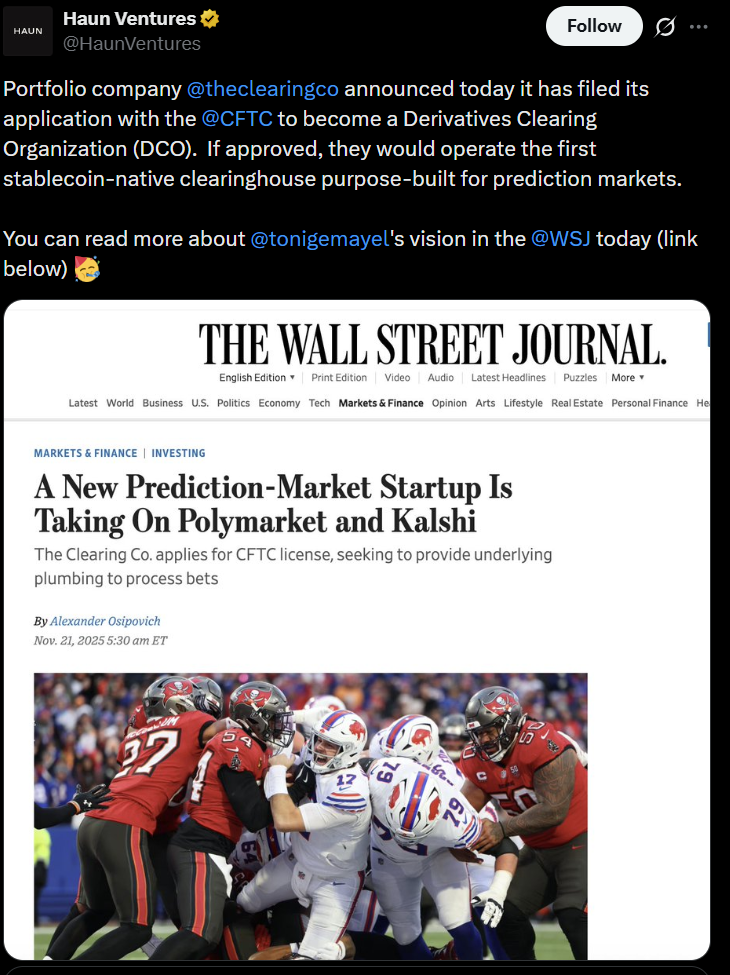 Este momento está a desenrolar-se juntamente com um panorama regulatório em mudança. No mês passado, a Clearing Company apresentou um pedido à Comissão de Comércio de Futuros de Commodities dos EUA para se tornar uma Organização de Liquidação de Derivados, numa etapa que poderia integrar ainda mais os mercados de previsão em estruturas financeiras estabelecidas.