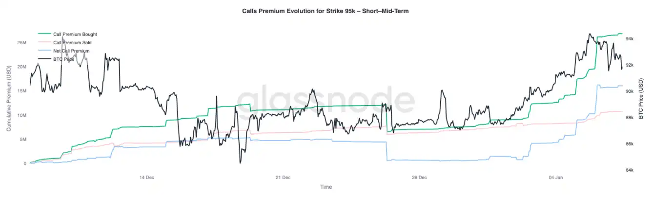 O comportamento do prêmio de opções de compra de 95.000 USD serve como um indicador eficaz para observar mudanças de sentimento de mercado. Em 1º de janeiro, quando o preço à vista ainda estava próximo de 87.000 USD, o prêmio de compra dessa opção começou a acelerar, aumentando à medida que o preço se aproximava do recente pico de 94.400 USD.