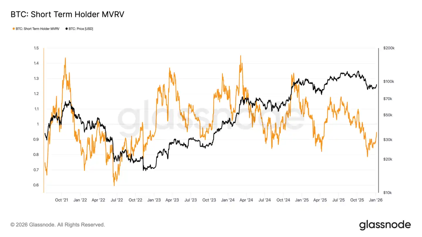 Esse movimento também é claramente refletido no indicador MVRV de detentores de curto prazo. Esse indicador compara o preço à vista com o custo médio de compra recente, refletindo o lucro ou prejuízo das posições.