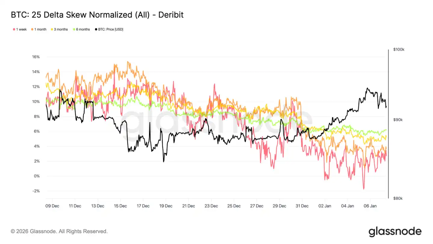 Com a estabilização da volatilidade implícita, a inclinação do mercado fornece uma visão mais clara das preferências de direção dos traders. Nos últimos 30 dias, o prêmio de opções de venda em relação às de compra diminuiu continuamente, e a curva de inclinação de 25 delta voltou progressivamente ao eixo zero.