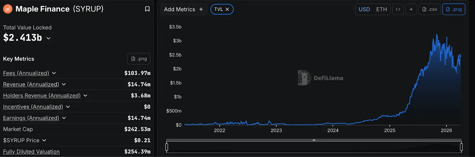 A Maple Finance, em 2025, viu o seu TVL disparar de 297 milhões de dólares para mais de 3,1 mil milhões de dólares. Em alguns períodos aproximou-se ainda de 3,3 mil milhões de dólares. O principal motor é a entrada de instituições no mercado de empréstimos de RWA: ao tokenizar empréstimos privados e empréstimos a empresas, para os usar em empréstimos e refinanciamentos “off-chain” com stablecoins.