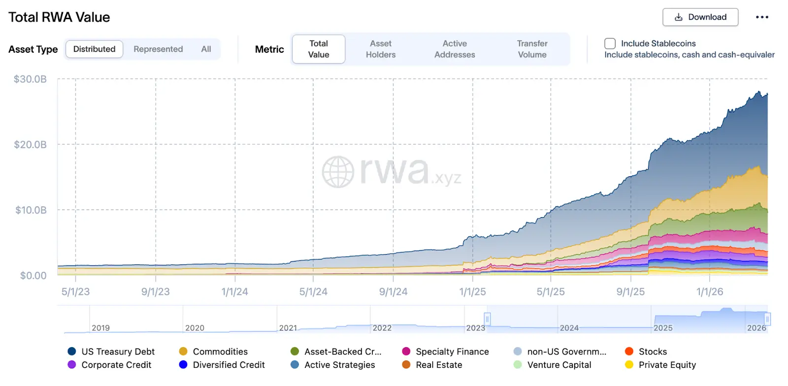 Nesta estrutura, o ponto mais crucial é o RWA: até ao final de março de 2026, o valor total dos RWA já atingiu 27,5 mil milhões de dólares. Face aos 8 mil milhões de dólares em março de 2025, em apenas um ano cresceu mais do que 2,4 vezes. Estes ativos são maioritariamente processados por protocolos como Aave Horizon, Maple Finance e Centrifuge. As instituições os utilizam como colateral para empréstimos estáveis, formando uma roda de “repo on-chain (acordo de recompra)” com re-tokenização do colateral.
