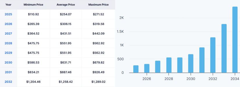 DigitalCoinPrice считает, что существует вероятность того, что QNT сможет преодолеть барьер $319.58, установив новый ориентир для своего торгового диапазона. Аналитики прогнозируют, что самая низкая цена будет находиться в диапазоне от $265.39 до $319.58, с наиболее вероятной ценой около $306.15 к концу года.