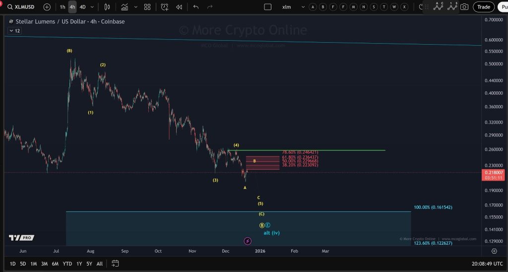 Stellar все еще находится в сложной ситуации. Динамика цен остается тяжелой, и более широкий тренд пока не изменился. На 4-часовом графике цена XLM продолжает двигаться внутри длительного нисходящего тренда, который контролирует цену в течение нескольких месяцев. Покупатели пытались вступить в игру, но последующие действия остаются ограниченными. Согласно анализу, представленному More Crypto Online, текущая структура указывает на то, что большая коррекция может быть близка к завершению. Тем не менее, график все еще оставляет место для еще одного снижения, прежде чем рынок сможет полностью перезагрузиться. Это удерживает цену XLM на важной точке принятия решения, где краткосрочные движения имеют большее значение, чем обычно.